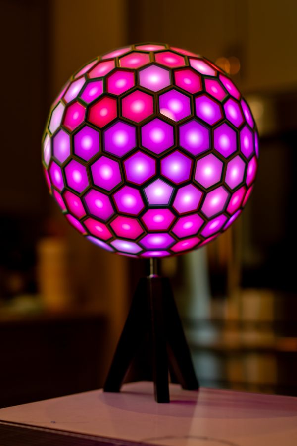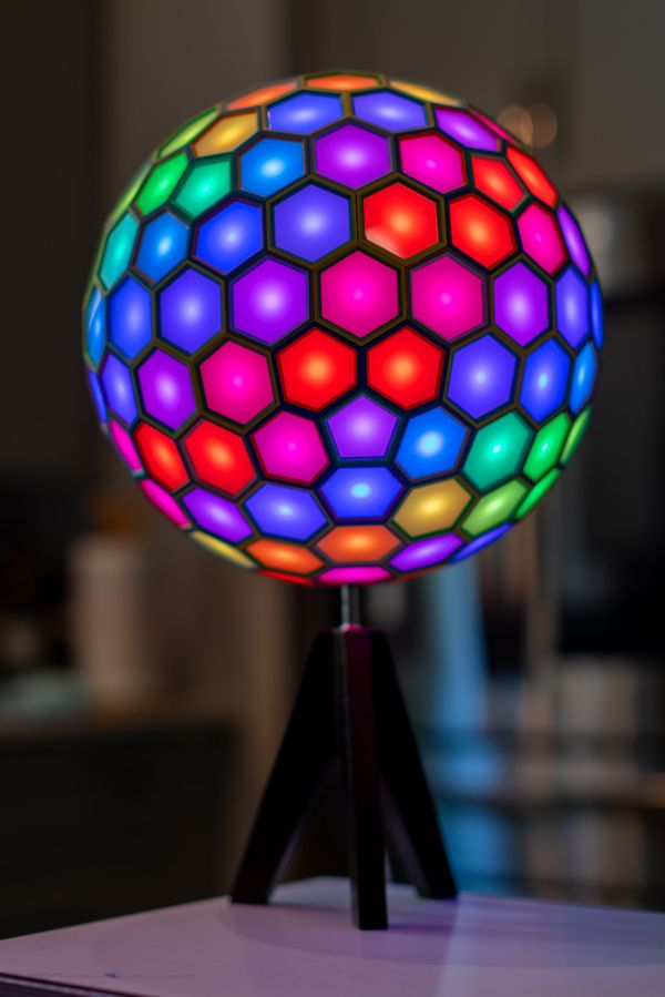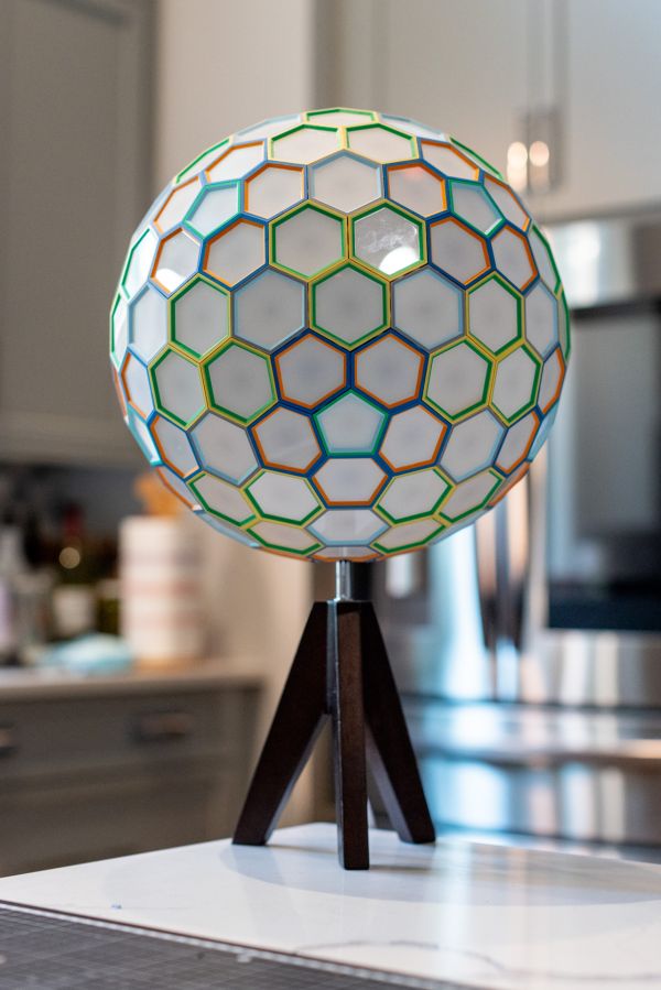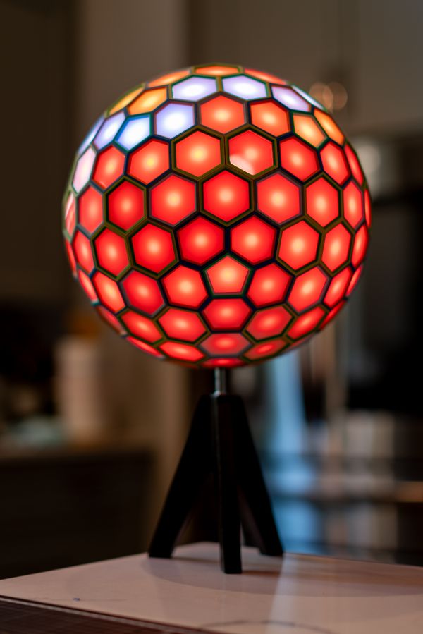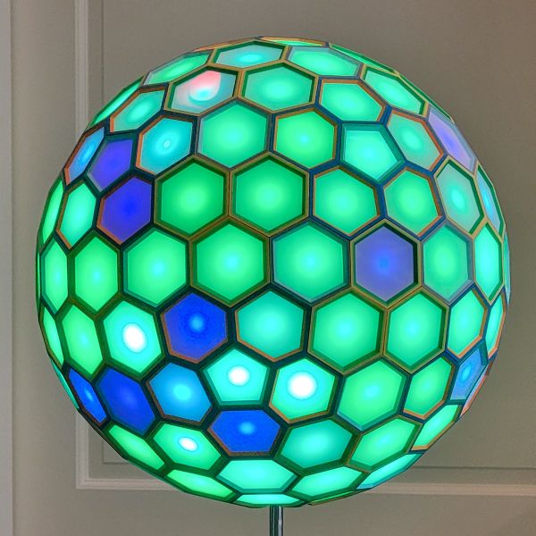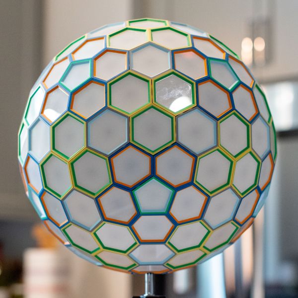 This one of a kind polyhedral is a Dual of 4 Frequency Icosahedral Geodesic Sphere that uses a new “lego-like” technique for assembly of a polyhedral using 3D printed internal pieces with laser cut faces. This has been in the works for months, and wasn’t exactly sure it would work. I designed each connector to also house an LED pixel bulb so each face will light up. The faces were laser cut using Milky White Cast Acrylic from Houston Acrylic. Polyhedral face pieces were 3D printed on a Bambu X1-Carbon. The internal WLED controller is a Dig2Go 3 powered by plugging into socket power adapter.