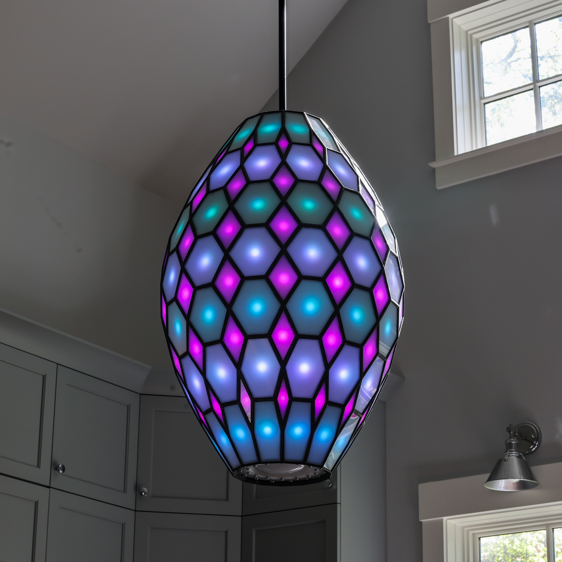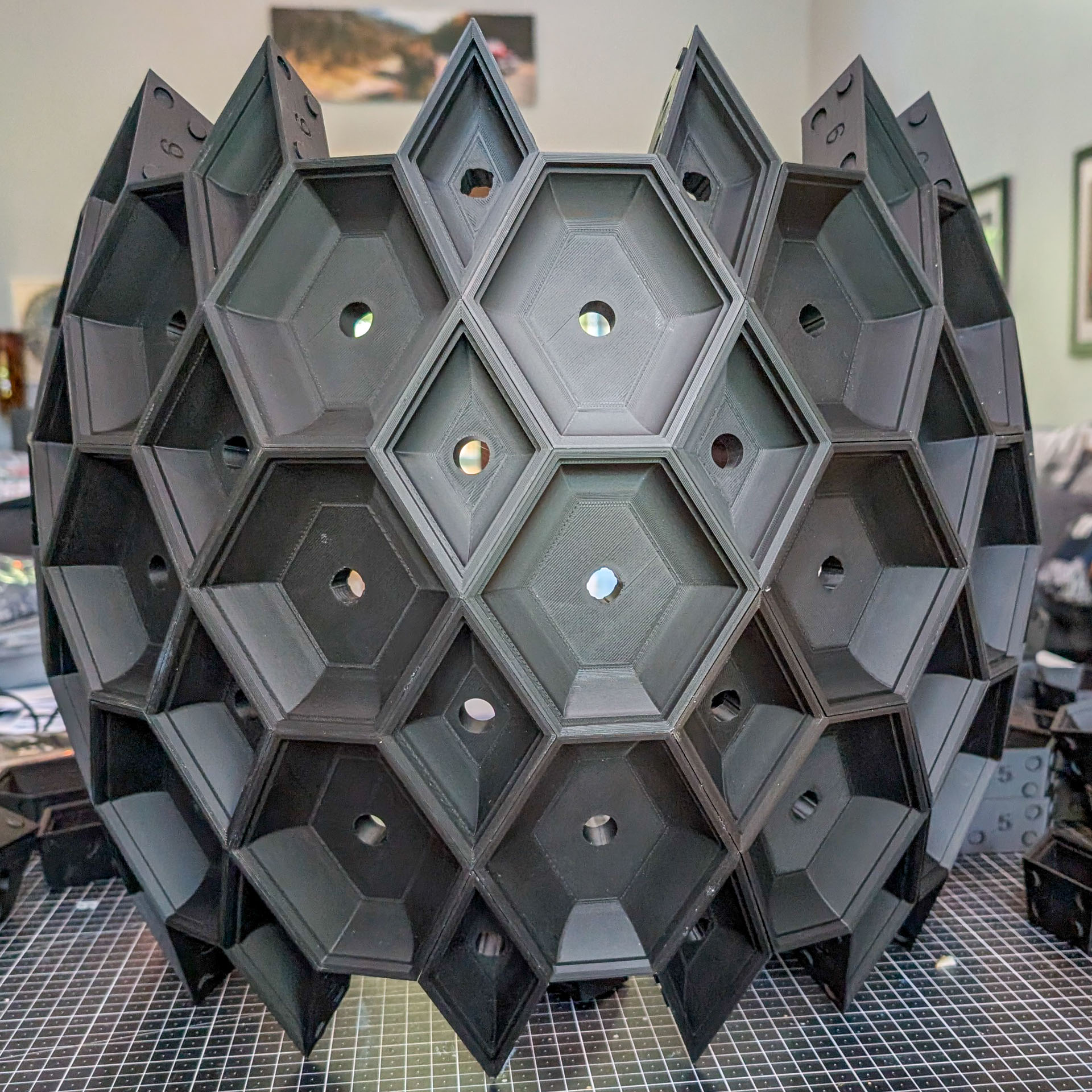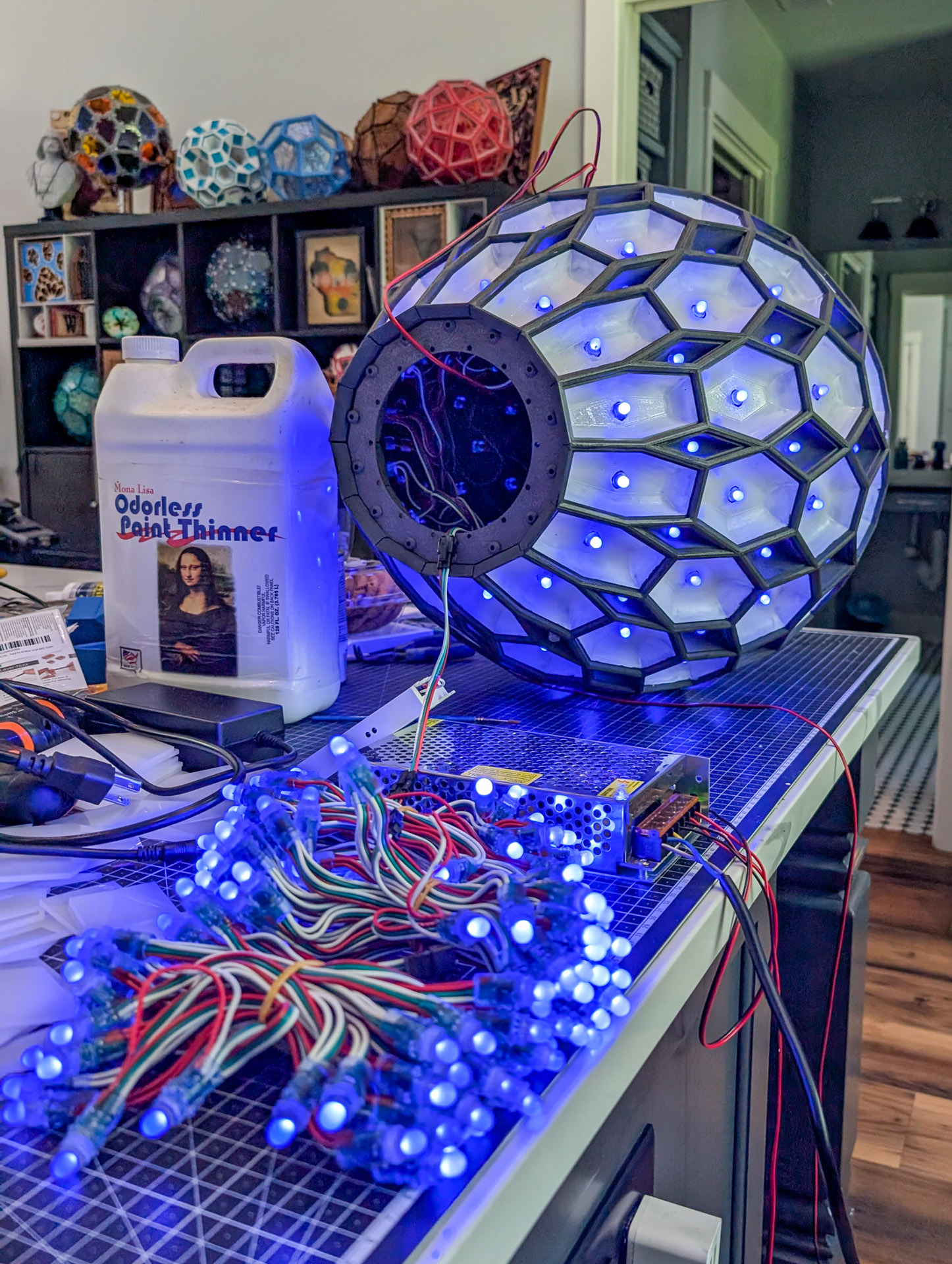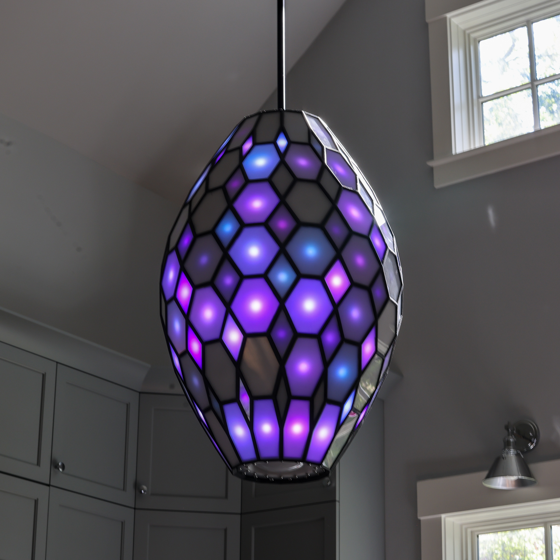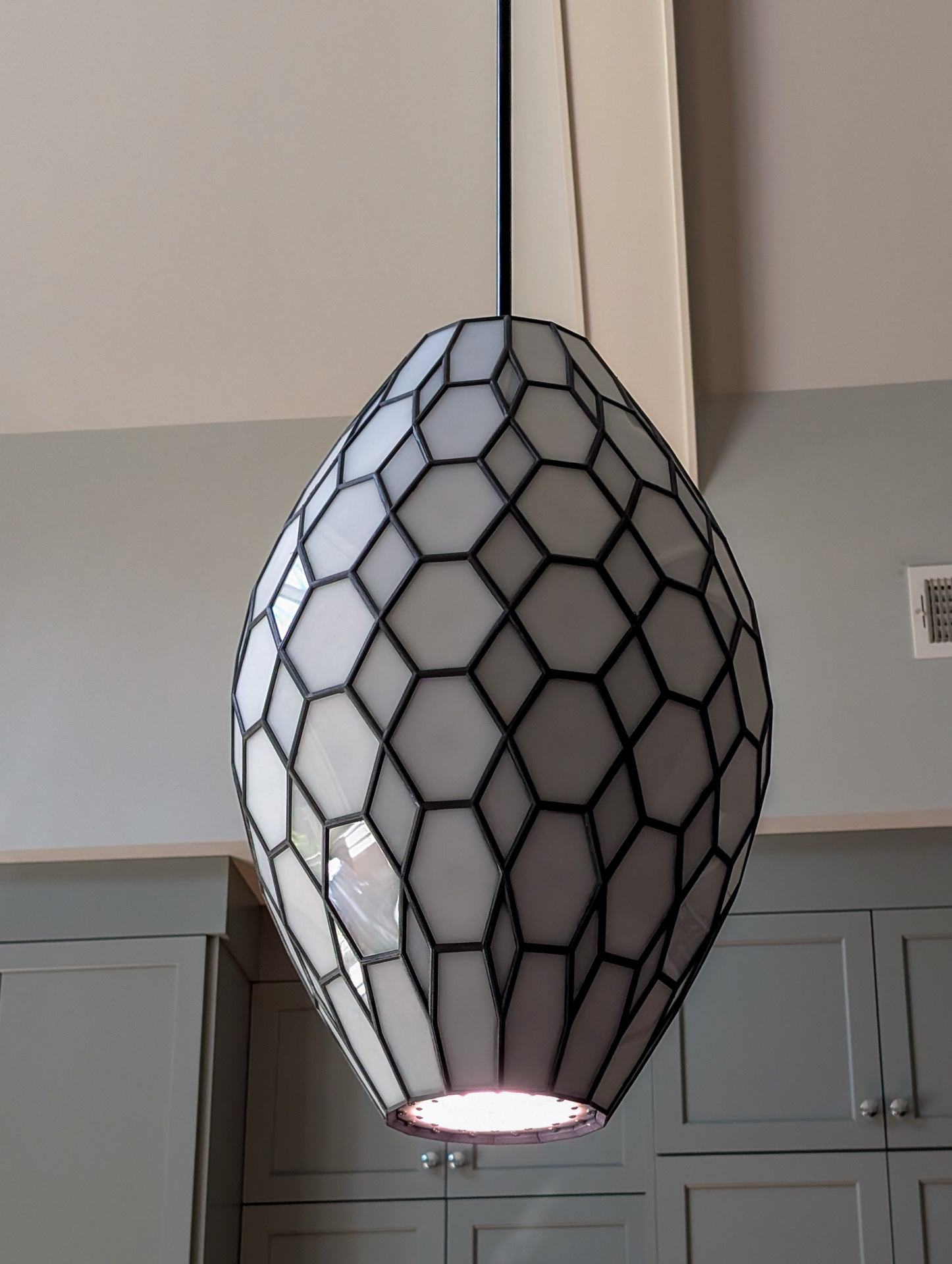 When I moved to South Carolina in 2021, I designed a fully accessible house which included a kitchen island. I purposely didn’t add any lighting over the island at the time knowing that I wanted to design and build something myself. I had many ideas, but eventually landed on creating an object that would expand on my polyhedral design capabilities, and add a unique WLED programmable lighting fixture, as well as a recessed can light to shine down on the island. This is the largest project I have done on any of my maker machines, and uses a combination of 3D printed parts and laser cut faces. I plan on making a second one to match, but this post contains the details of finishing the first one. I needed a lot of assistance on this due to my disability, so it took a few months and many sessions to complete. I’ll post pics after the second on is complete later this year.