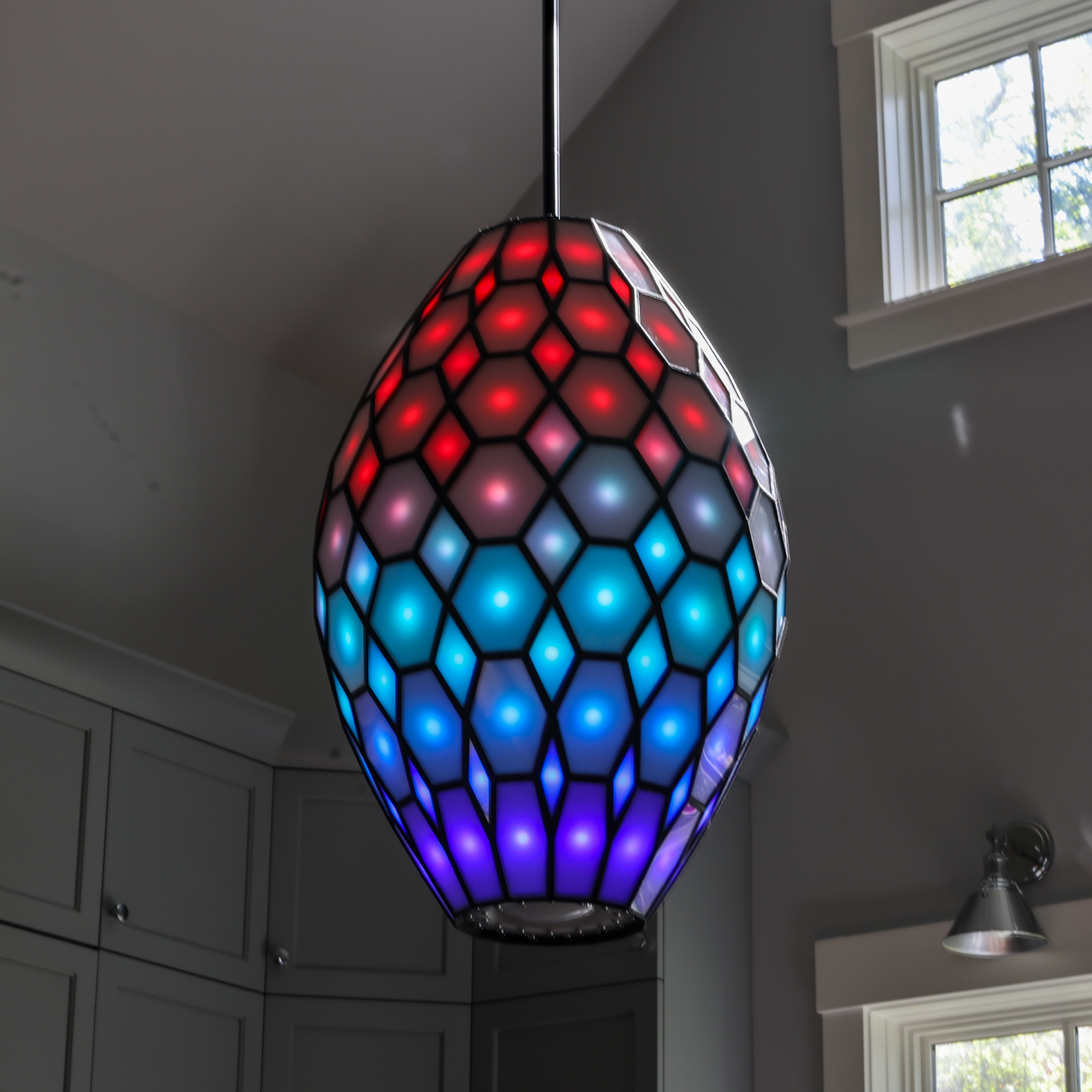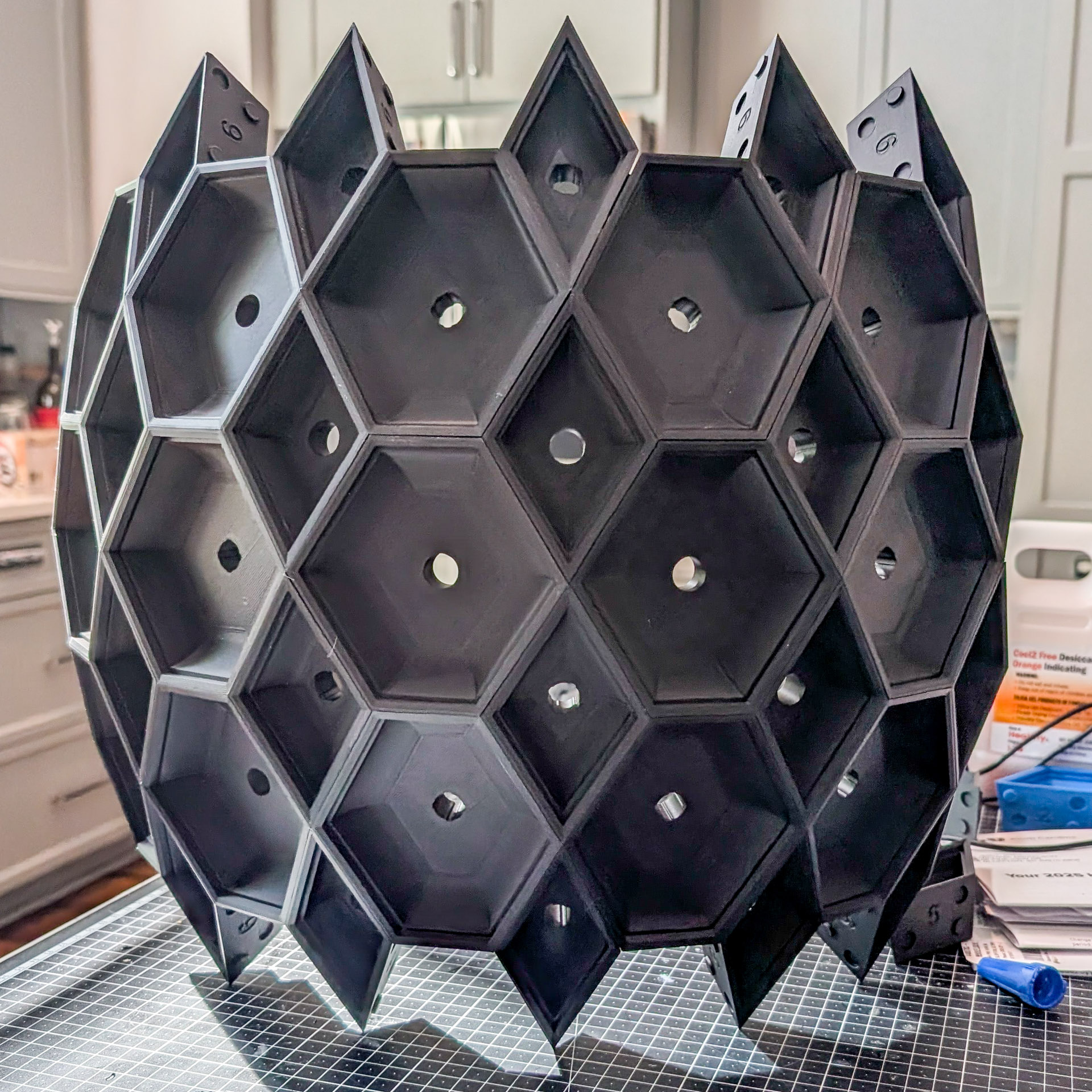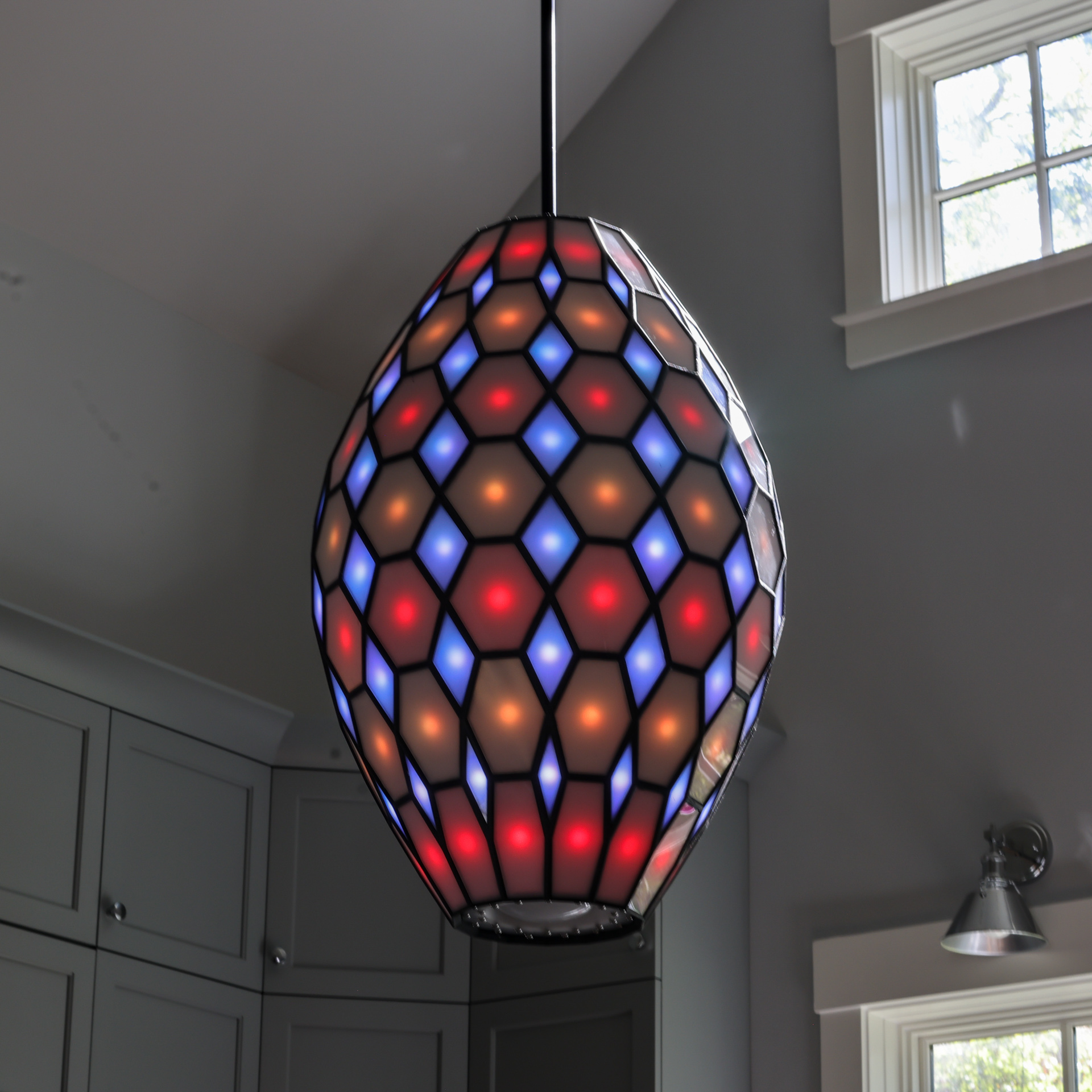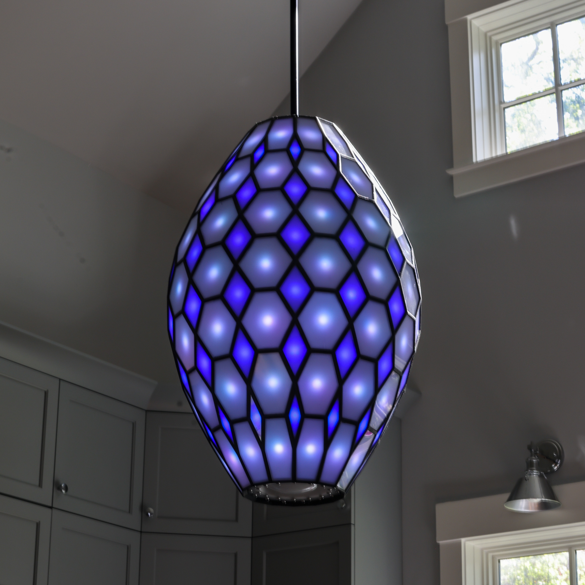When I moved to South Carolina in 2021, I designed a fully accessible house which included a kitchen island. I purposely didn’t add any lighting over the island at the time knowing that I wanted to design and build something myself. I had many ideas, but eventually landed on creating an object that would expand on my polyhedral design capabilities, and add a unique WLED programmable lighting fixture, as well as a recessed can light to shine down on the island. This is the largest project I have done on any of my maker machines, and uses a combination of 3D printed parts and laser cut faces. I plan on making a second one to match, but this post contains the details of finishing the first one. I needed a lot of assistance on this due to my disability, so it took a few months and many sessions to complete. I’ll post pics after the second on is complete later this year.