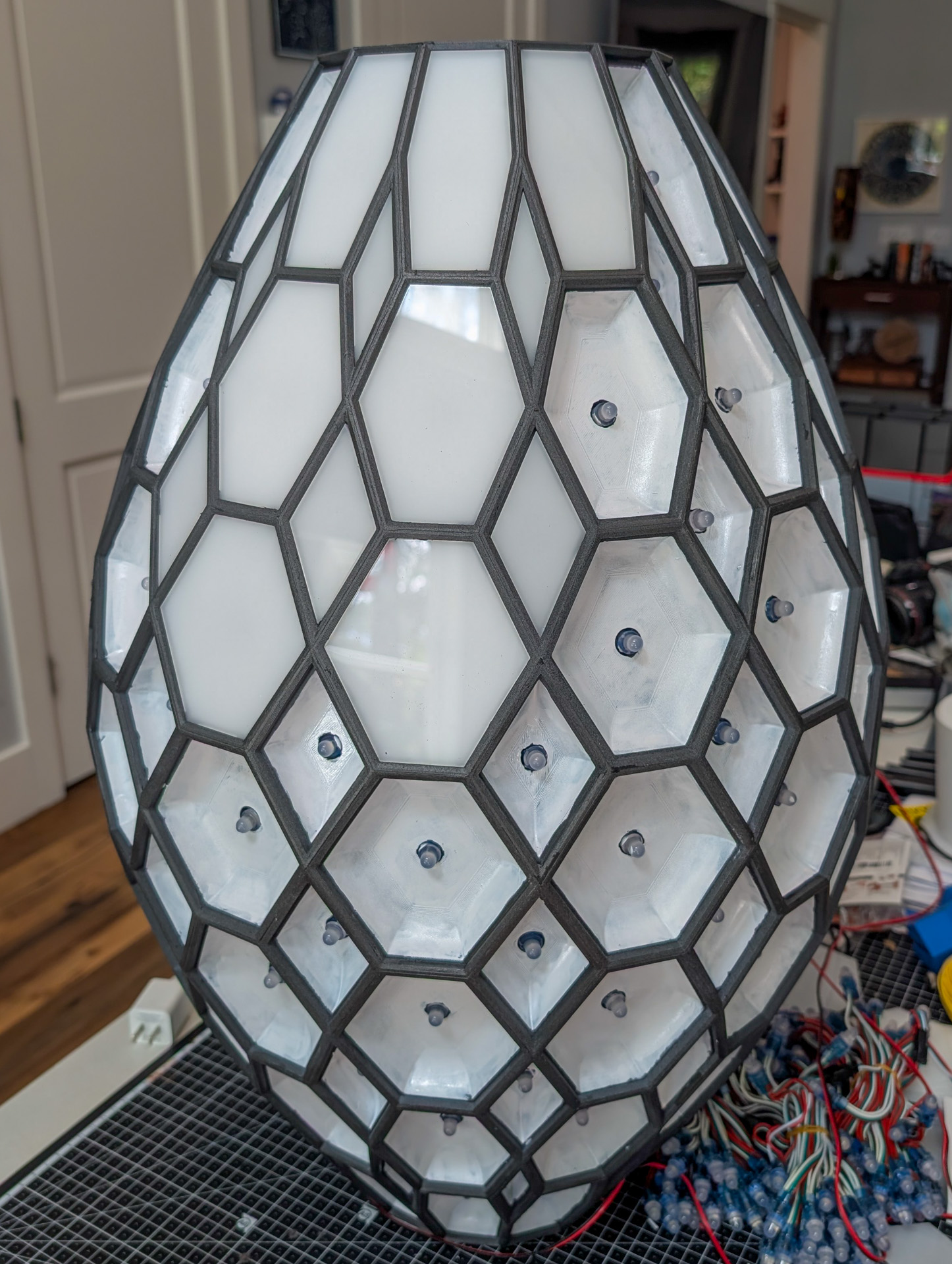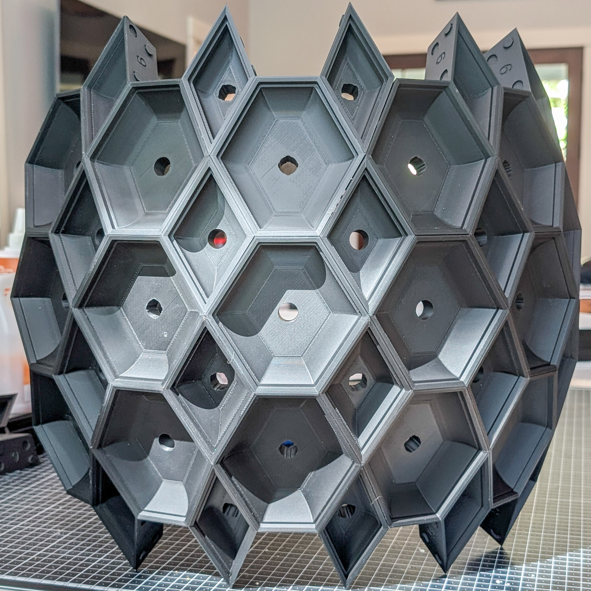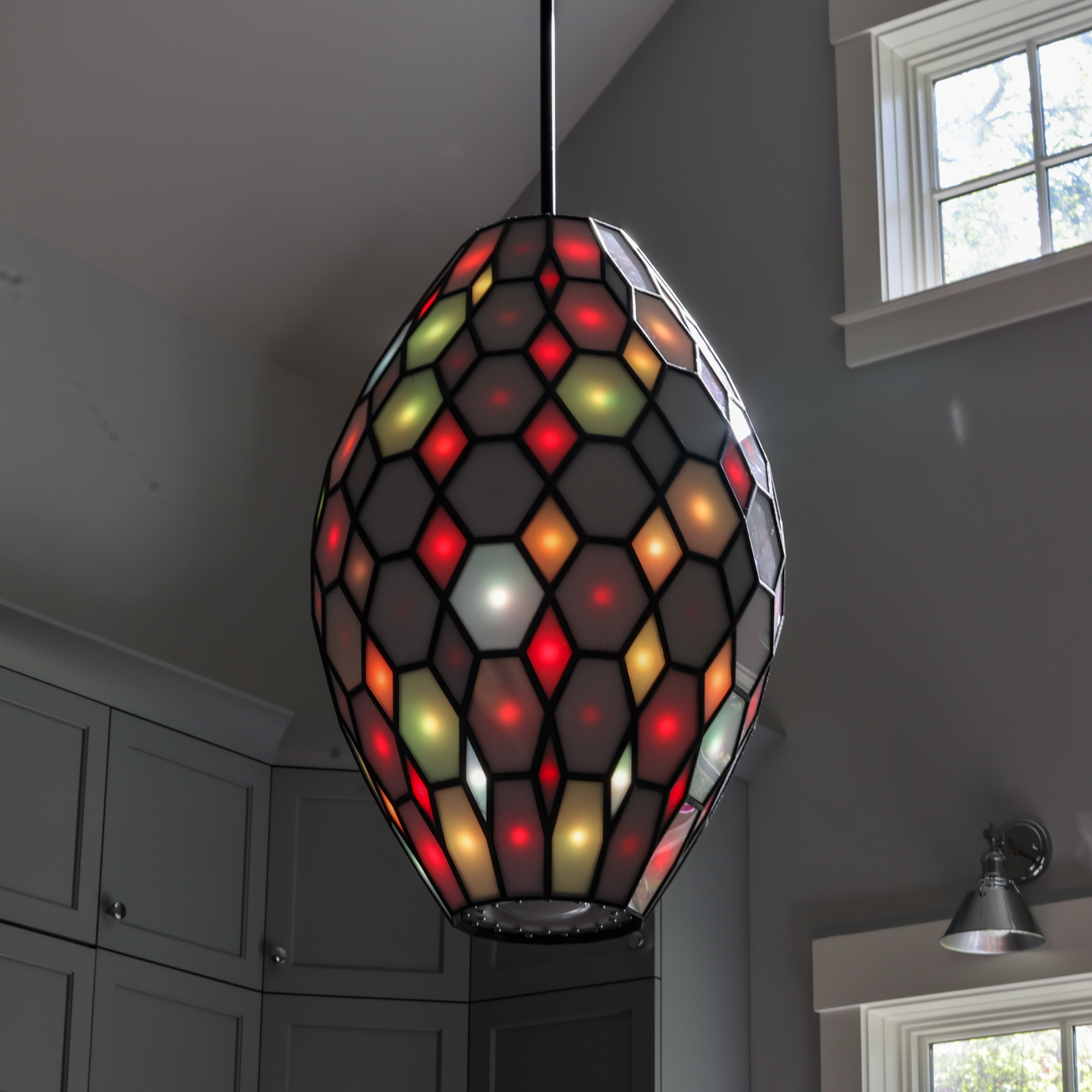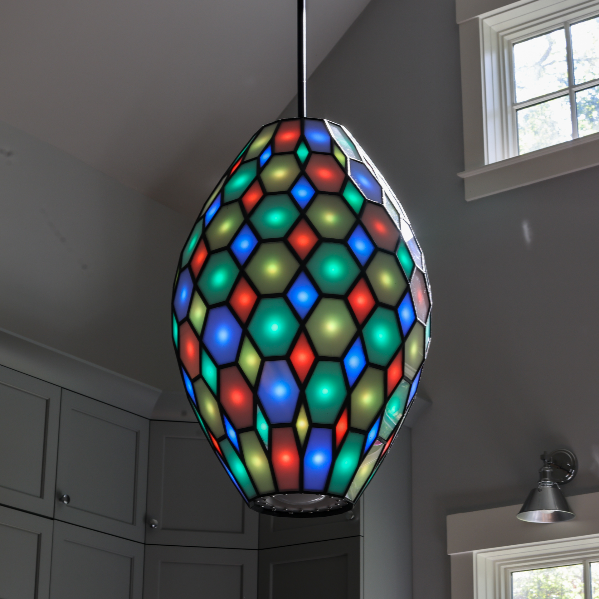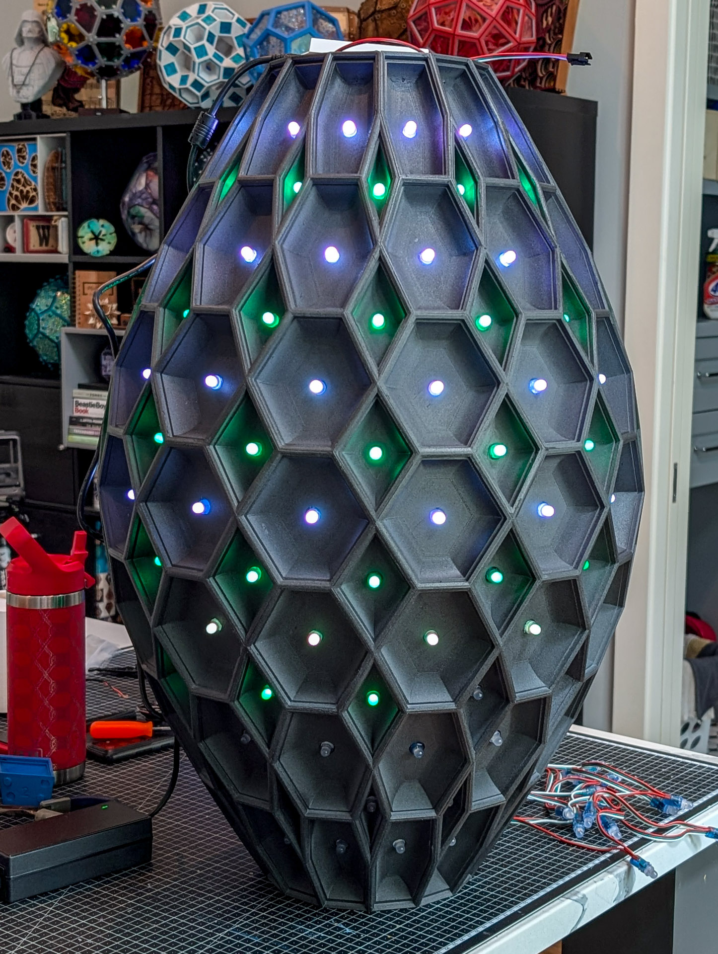 When I moved to South Carolina in 2021, I designed a fully accessible house which included a kitchen island. I purposely didn’t add any lighting over the island at the time knowing that I wanted to design and build something myself. I had many ideas, but eventually landed on creating an object that would expand on my polyhedral design capabilities, and add a unique WLED programmable lighting fixture, as well as a recessed can light to shine down on the island. This is the largest project I have done on any of my maker machines, and uses a combination of 3D printed parts and laser cut faces. I plan on making a second one to match, but this post contains the details of finishing the first one. I needed a lot of assistance on this due to my disability, so it took a few months and many sessions to complete. I’ll post pics after the second on is complete later this year.