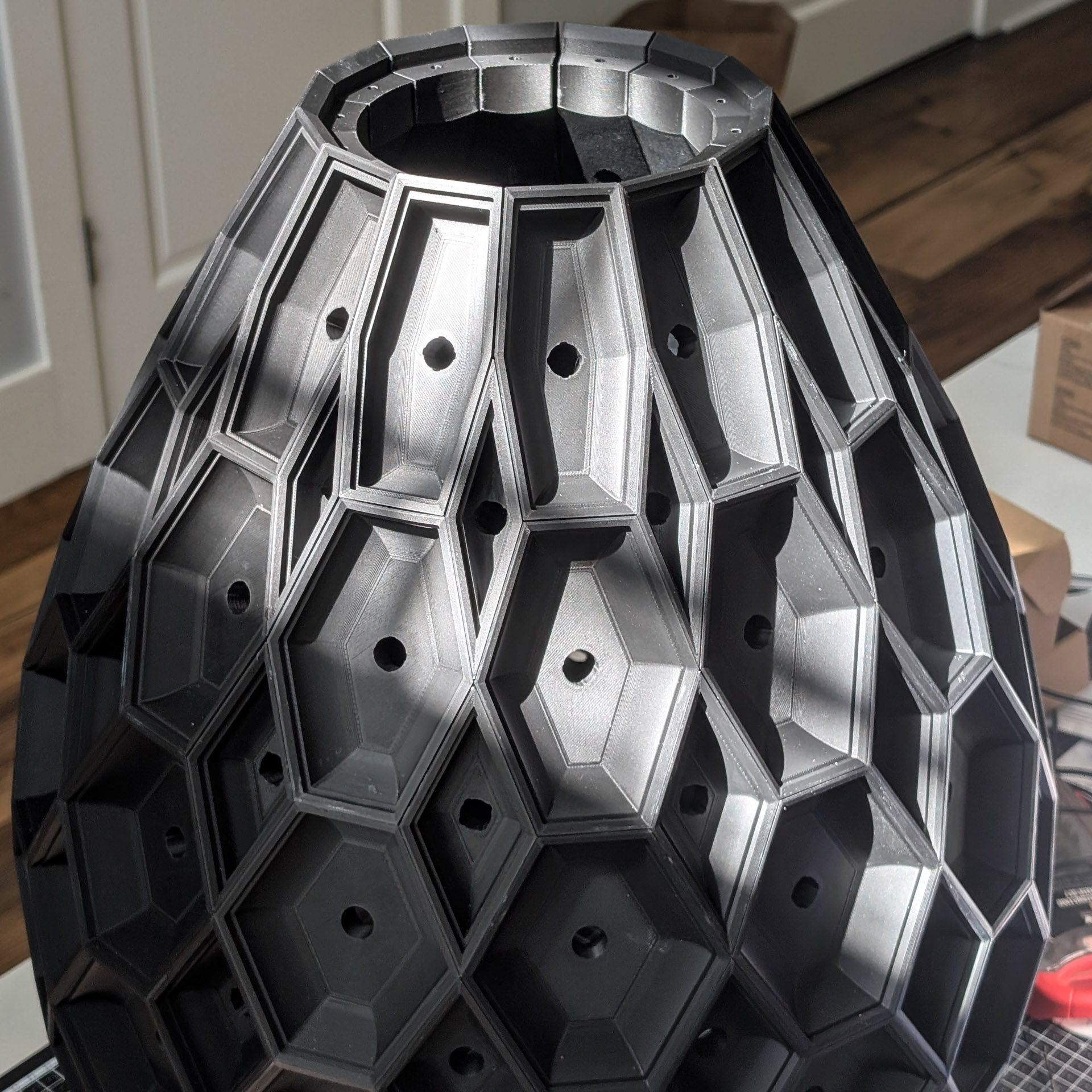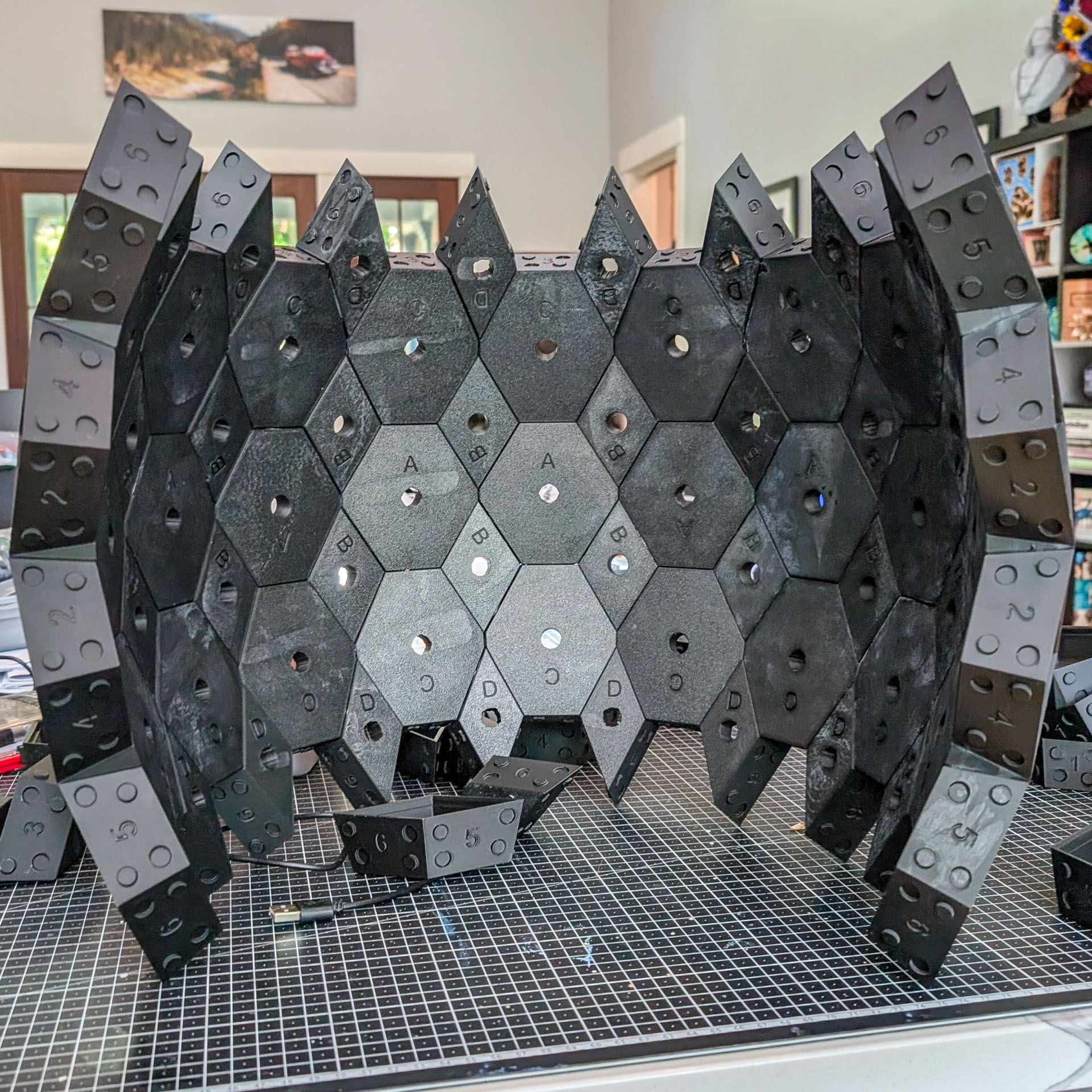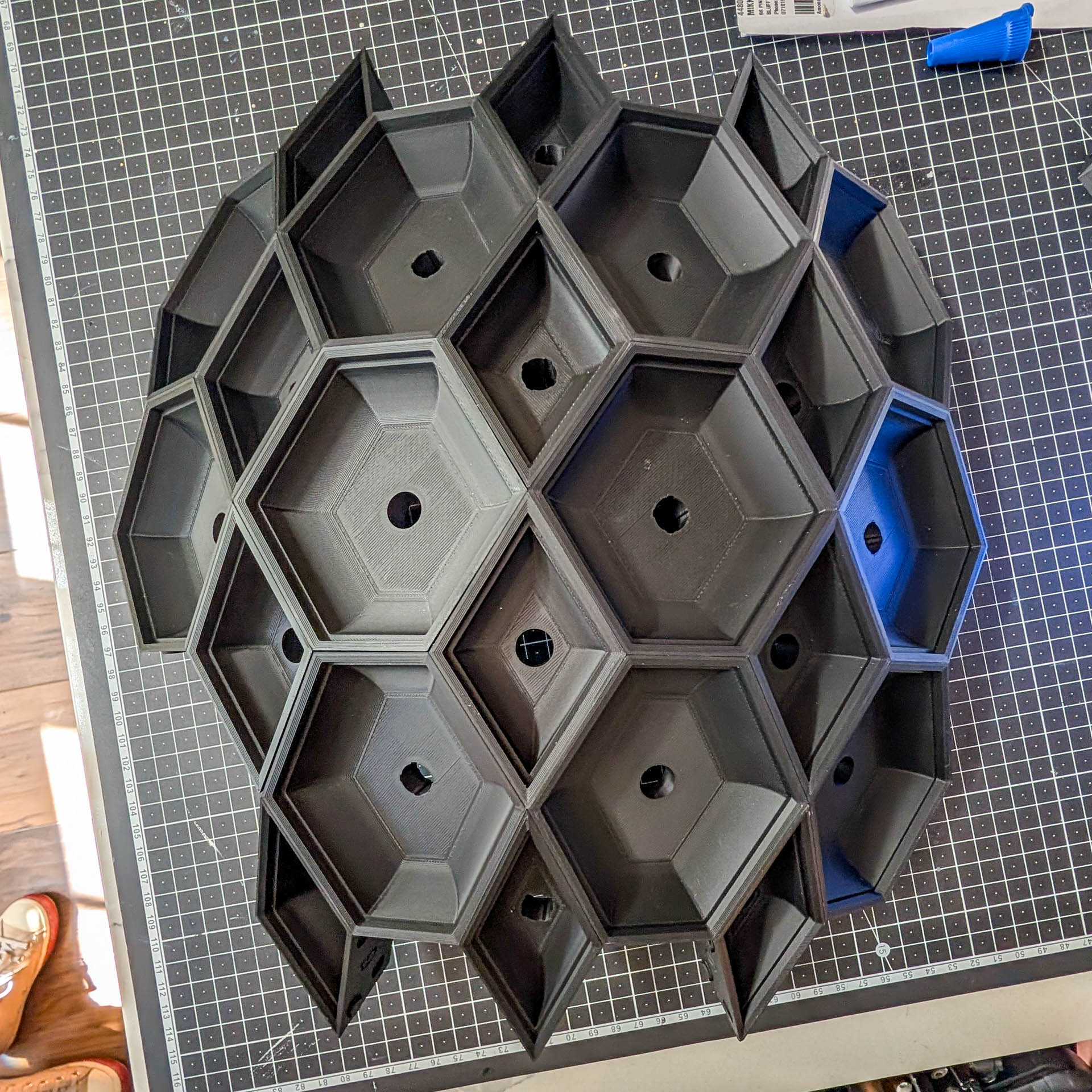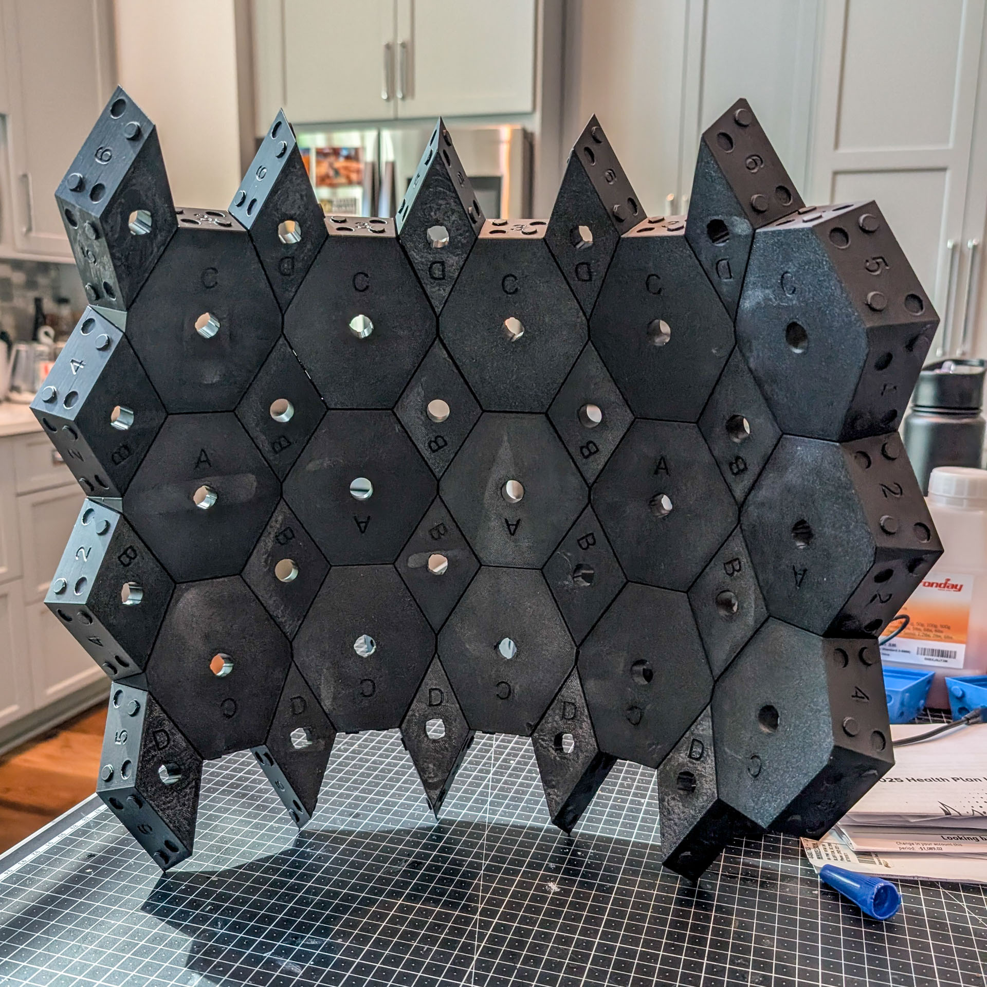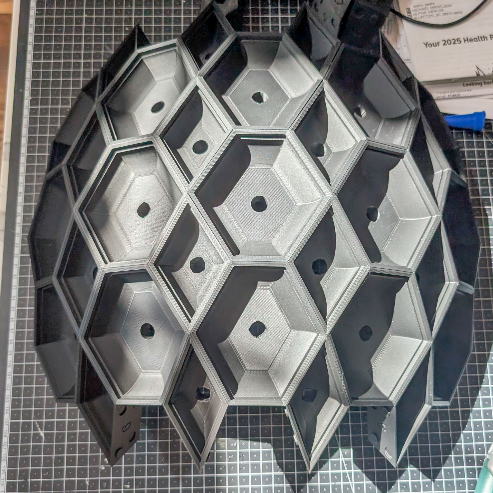 When I moved to South Carolina in 2021, I designed a fully accessible house which included a kitchen island. I purposely didn’t add any lighting over the island at the time knowing that I wanted to design and build something myself. I had many ideas, but eventually landed on creating an object that would expand on my polyhedral design capabilities, and add a unique WLED programmable lighting fixture, as well as a recessed can light to shine down on the island. This is the largest project I have done on any of my maker machines, and uses a combination of 3D printed parts and laser cut faces. I plan on making a second one to match, but this post contains the details of finishing the first one. I needed a lot of assistance on this due to my disability, so it took a few months and many sessions to complete. I’ll post pics after the second on is complete later this year.