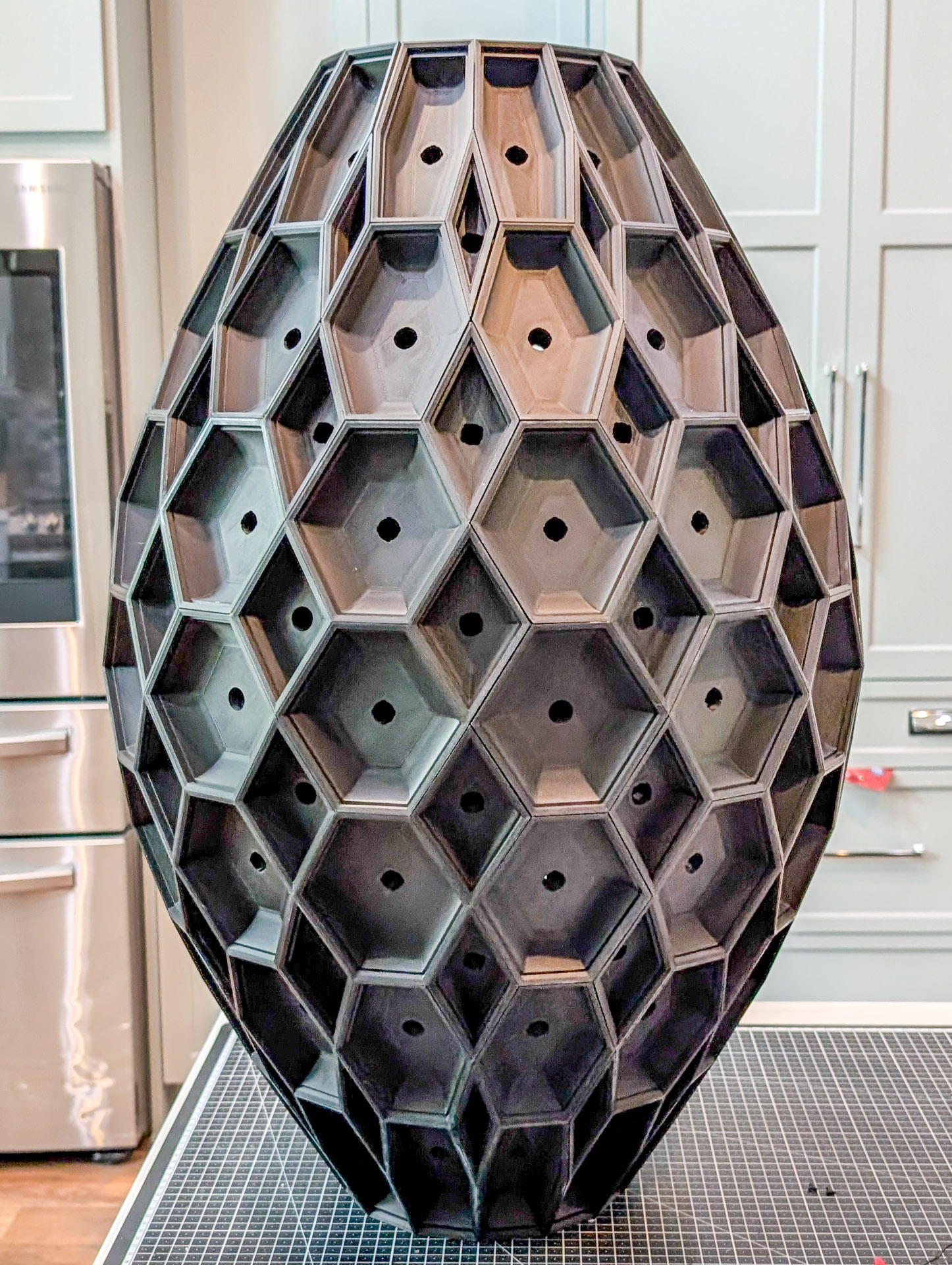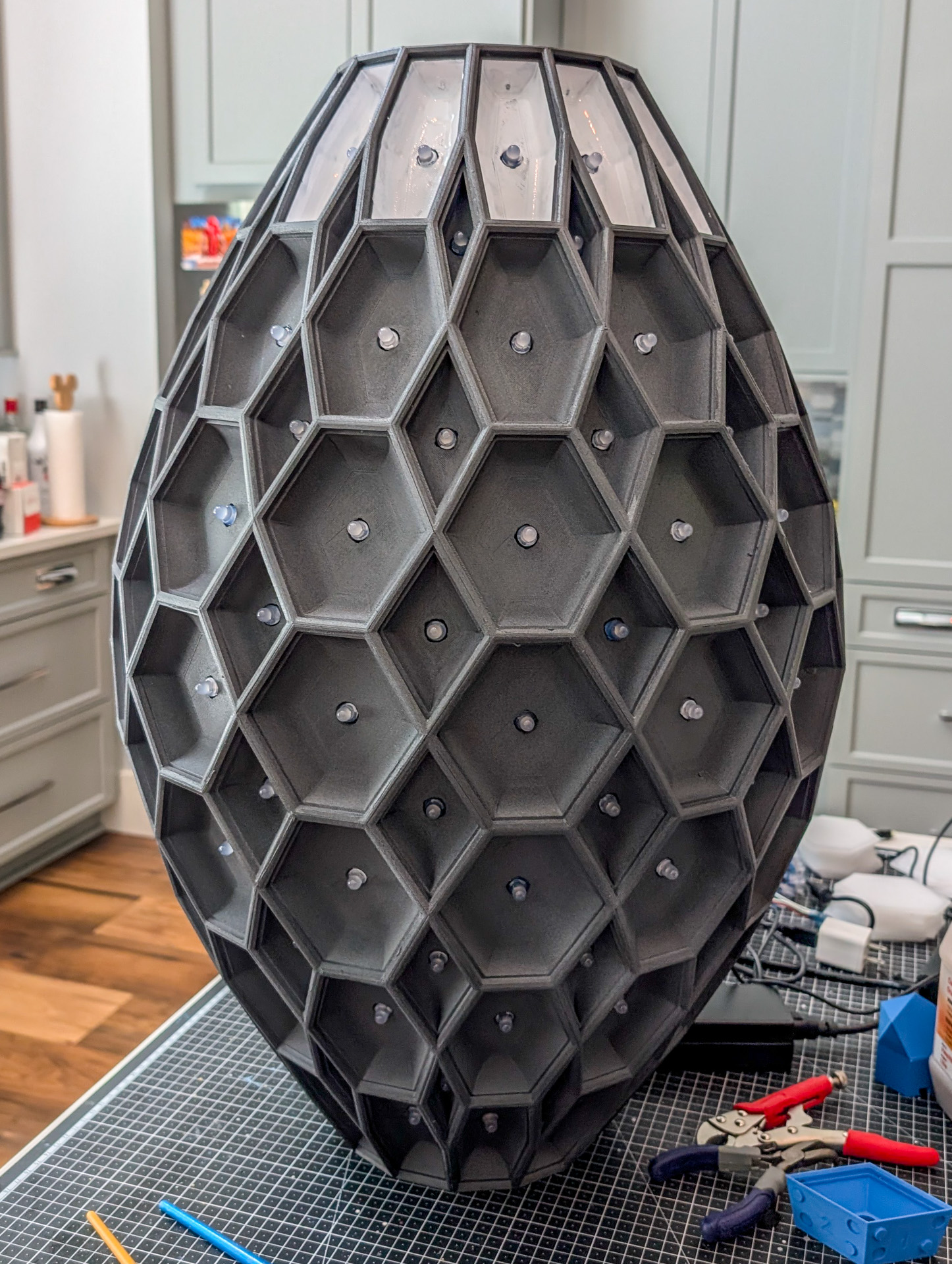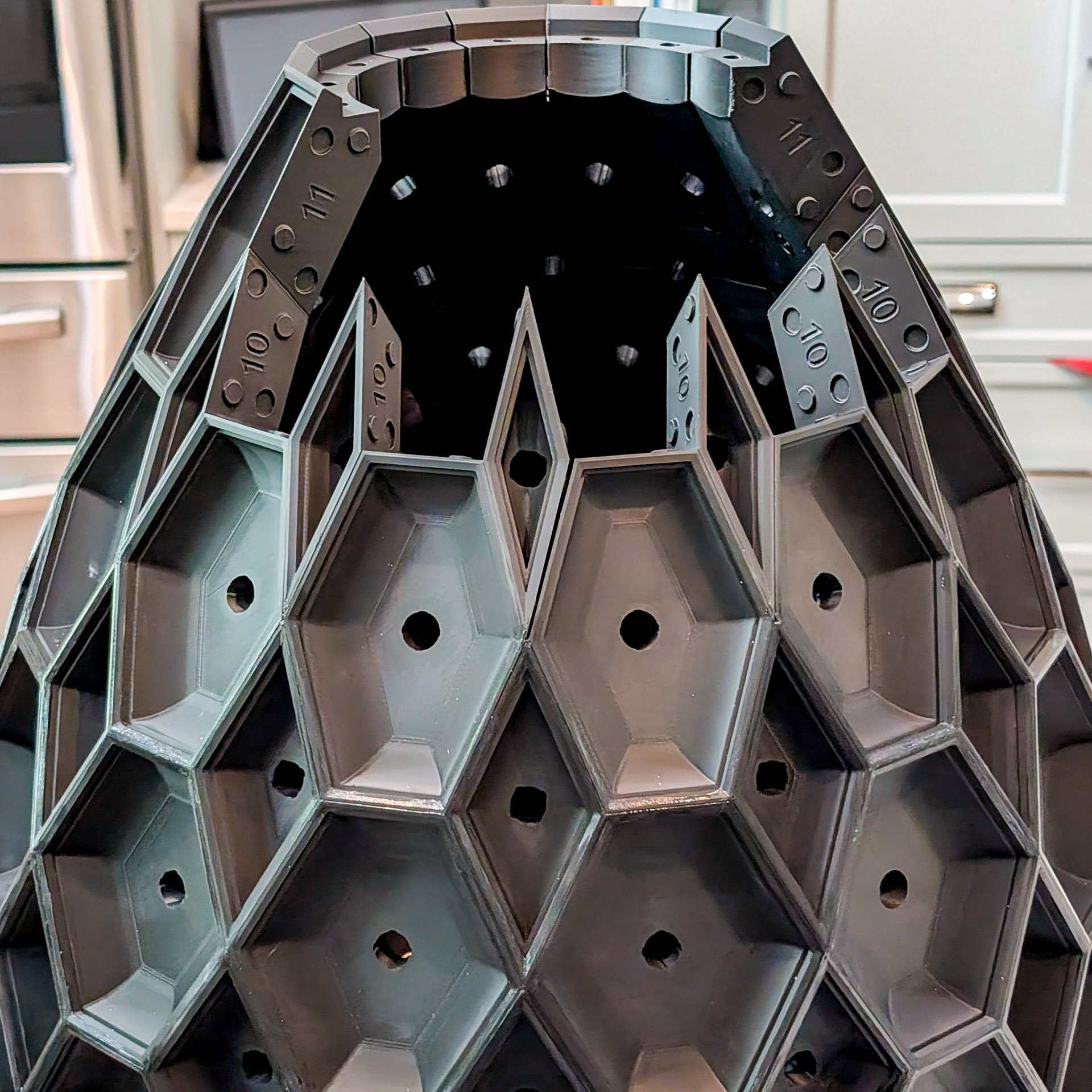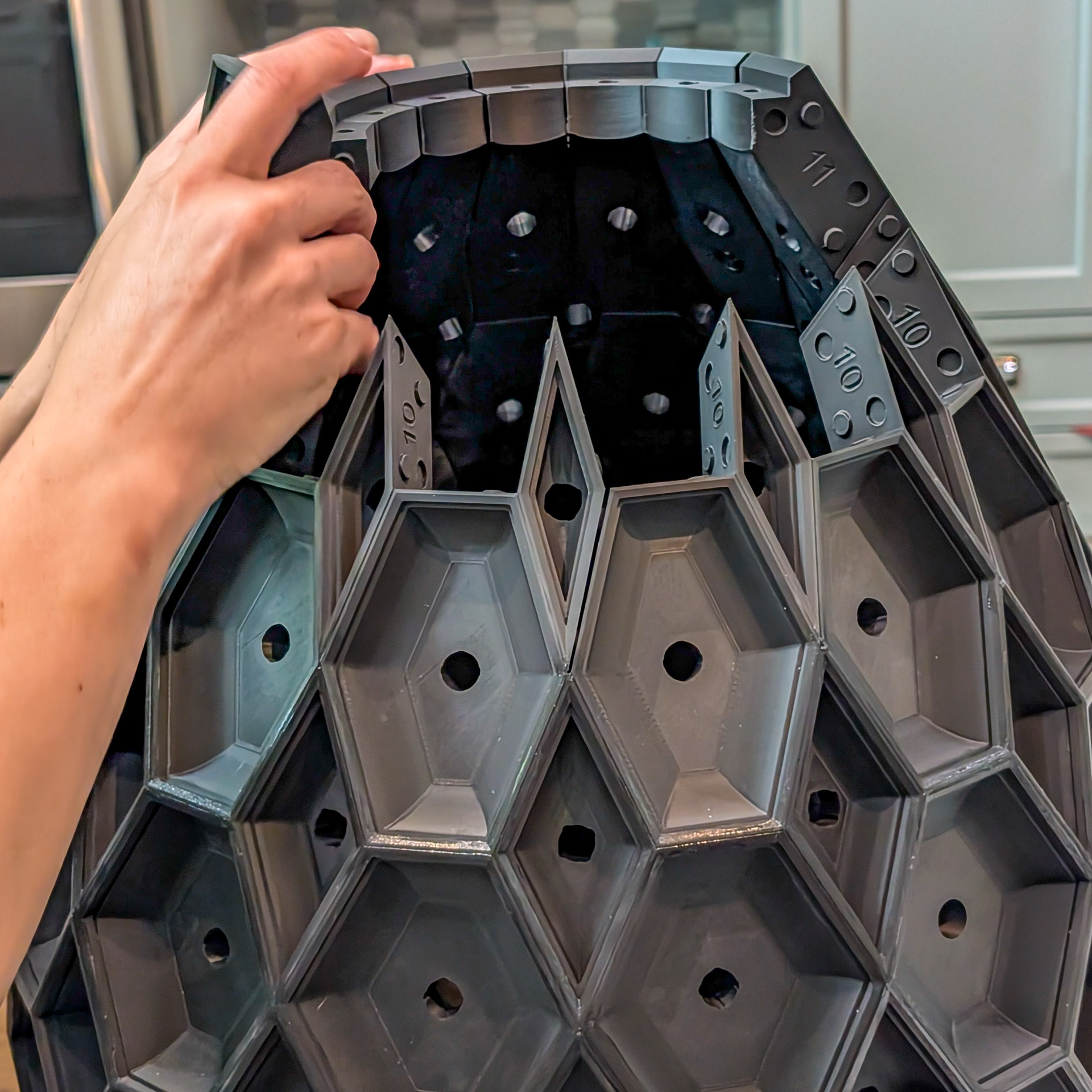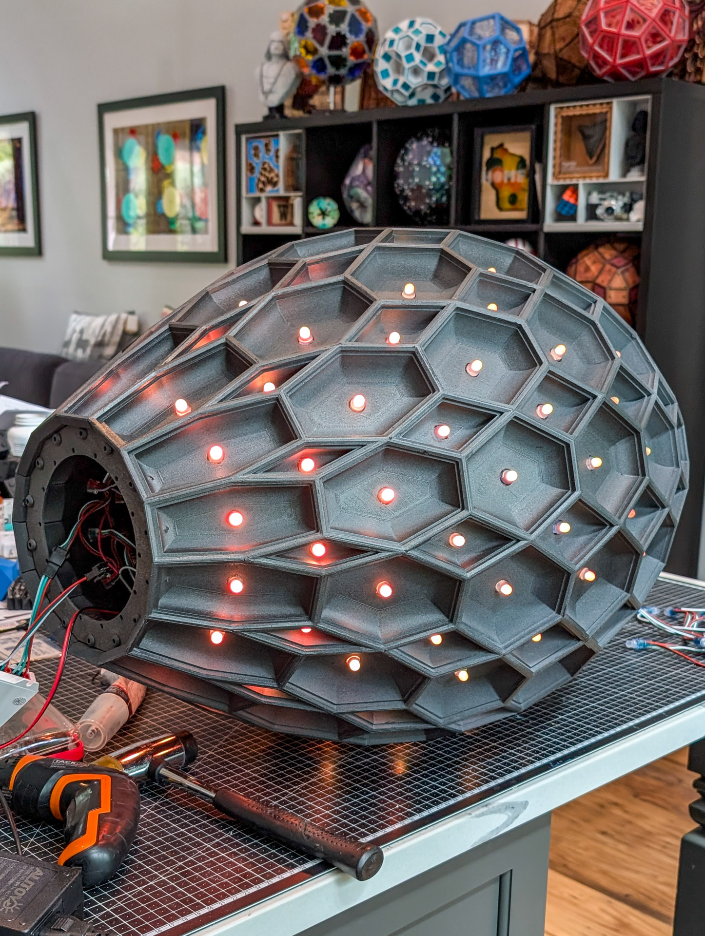 When I moved to South Carolina in 2021, I designed a fully accessible house which included a kitchen island. I purposely didn’t add any lighting over the island at the time knowing that I wanted to design and build something myself. I had many ideas, but eventually landed on creating an object that would expand on my polyhedral design capabilities, and add a unique WLED programmable lighting fixture, as well as a recessed can light to shine down on the island. This is the largest project I have done on any of my maker machines, and uses a combination of 3D printed parts and laser cut faces. I plan on making a second one to match, but this post contains the details of finishing the first one. I needed a lot of assistance on this due to my disability, so it took a few months and many sessions to complete. I’ll post pics after the second on is complete later this year.